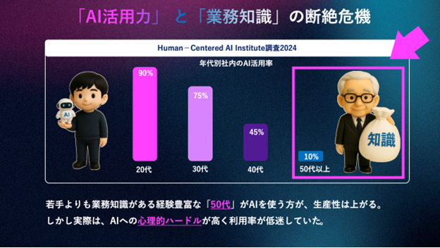 生成AIの活用が企業の競争力を左右する時代において、AI活用の浸透度には世代間で大きな差が生まれている。業務知識と経験を豊富に持つベテラン層がAIを使いこなせれば、若手以上のインパクトを生み出せるにもかかわらず、多くの企業ではベテラン層のAI活用率が低いままだ。その背景には、技術習熟の問題だけではない「心理的な壁」が存在する。